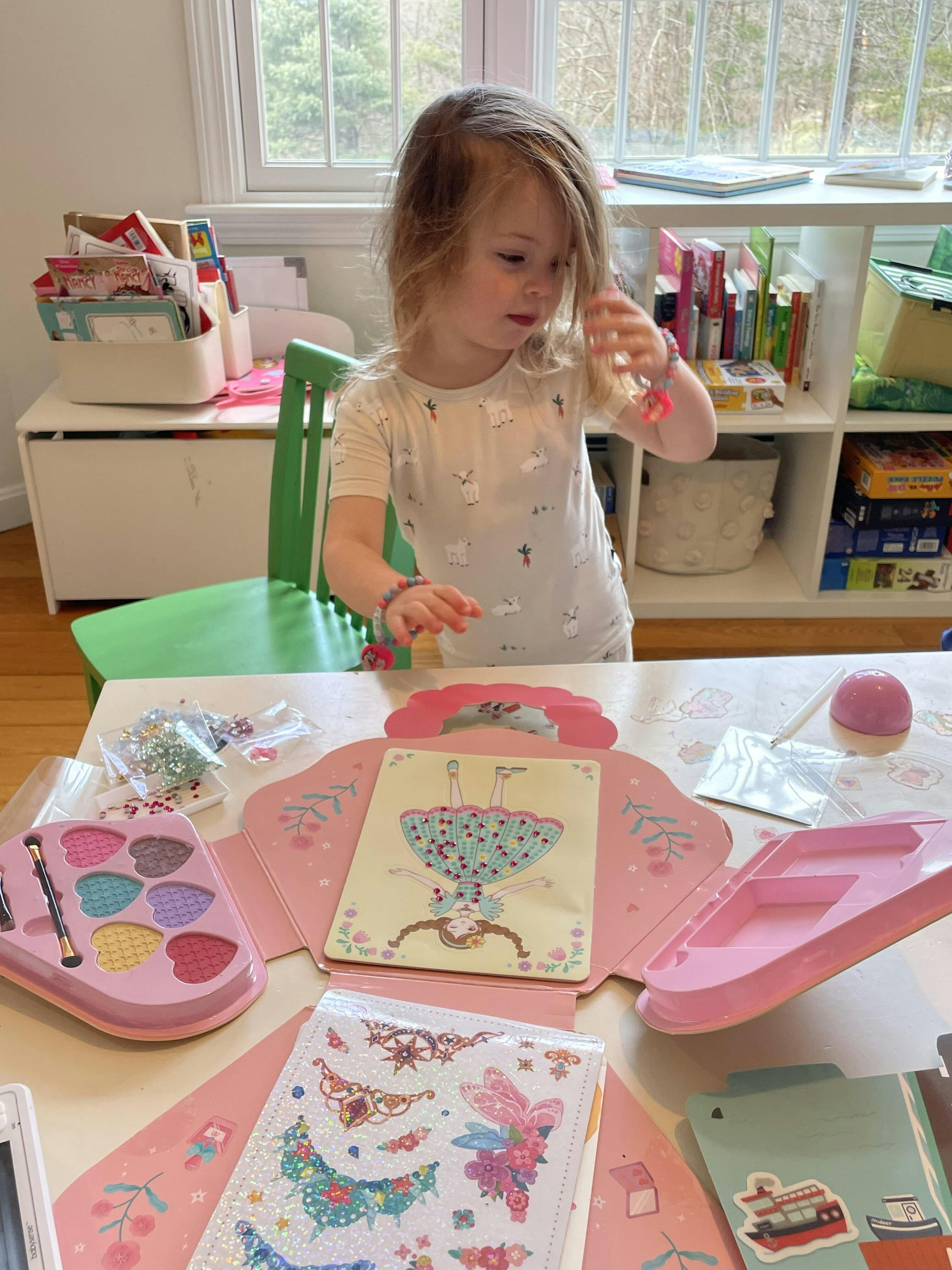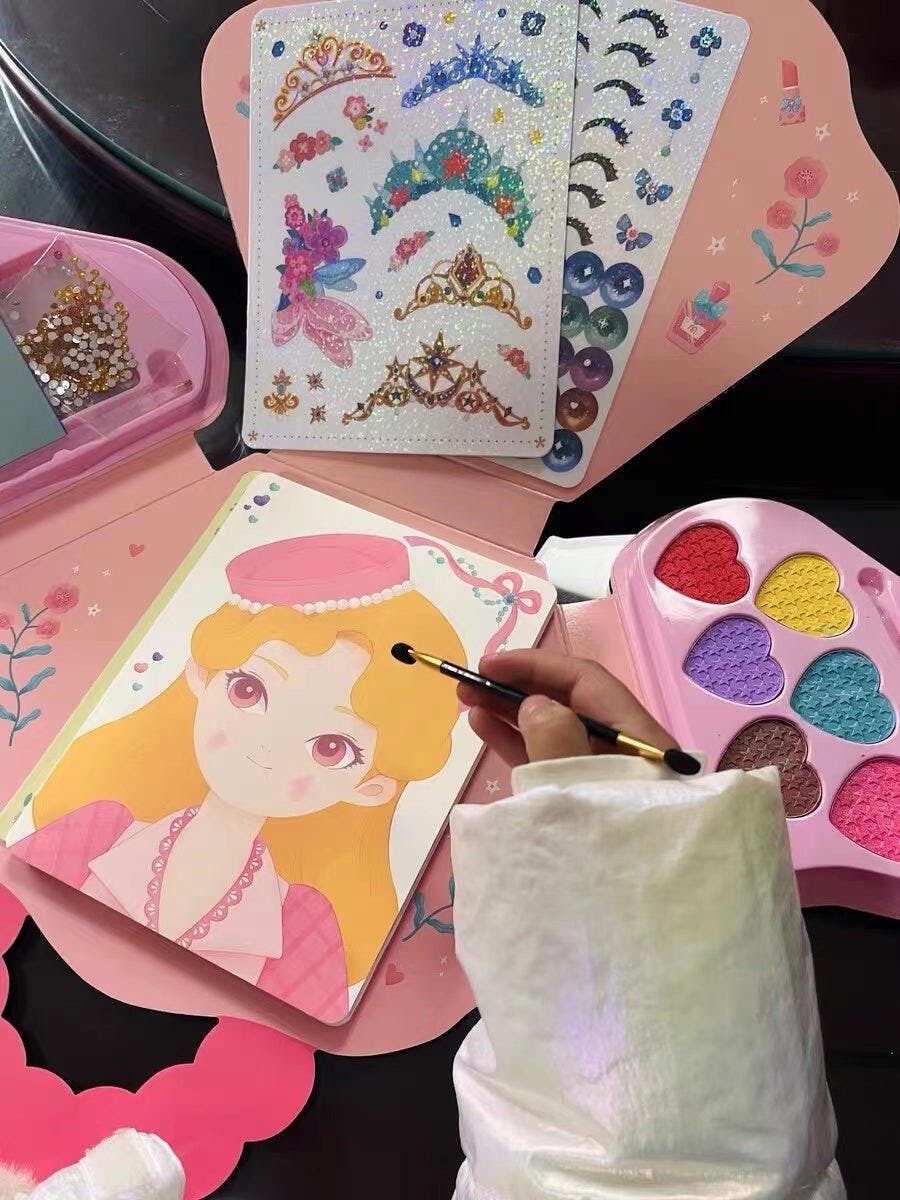 Features makeup application, sticker decorations, and gemstone/foil stickers to boost imaginative play.